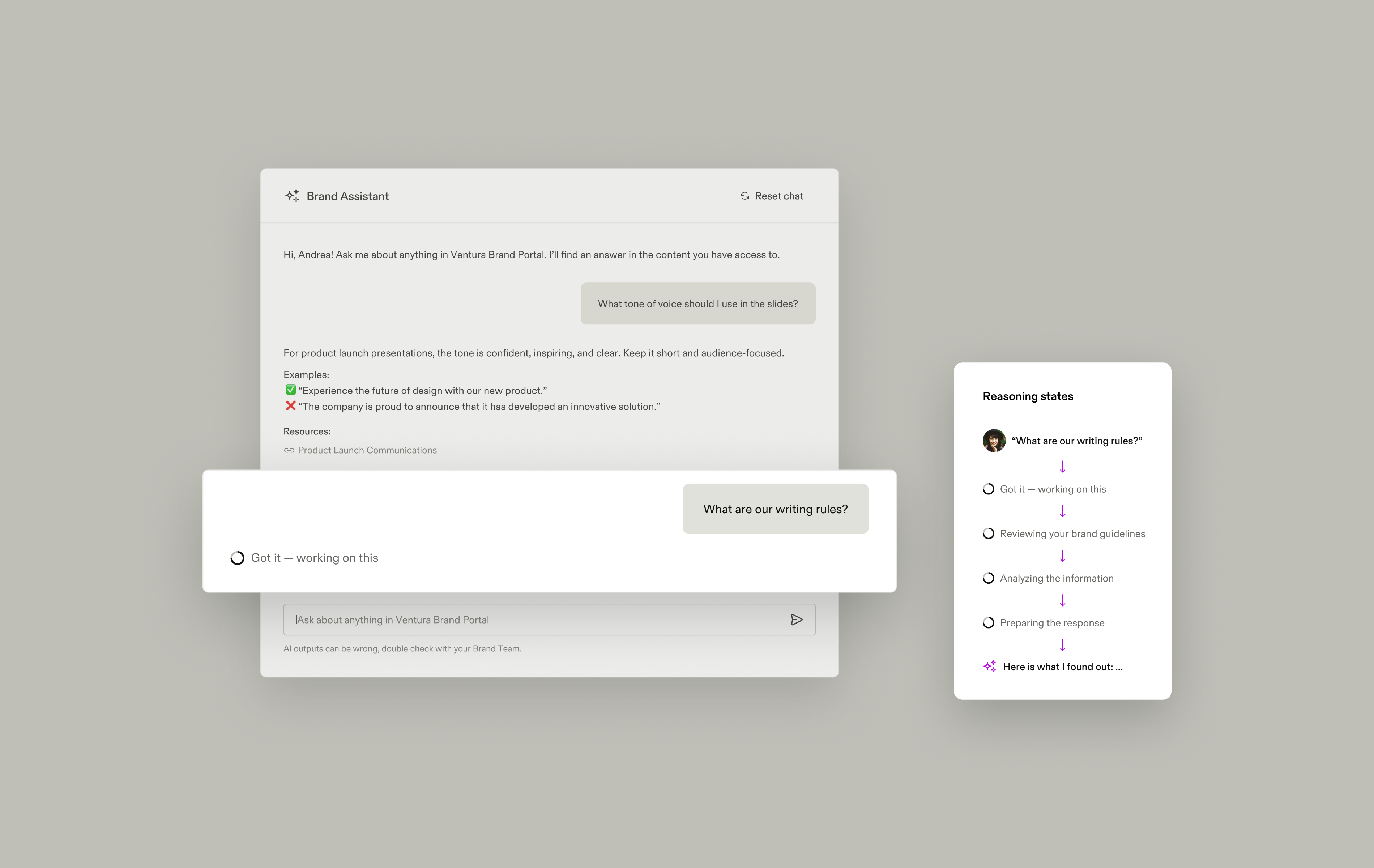 The Brand Assistant became a reference point for how AI should be designed across Frontify — transparent, assistive, and user-controlled.